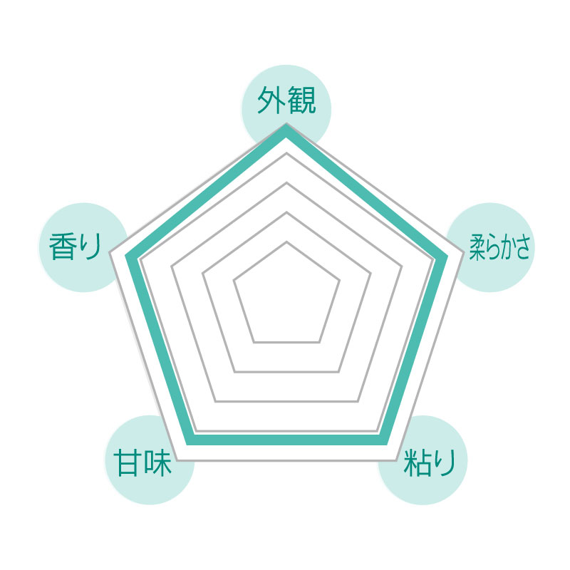 外観 ★★★★★(5) 柔らかさ ★★★★☆(4) 粘り ★★★★☆(4) 甘味 ★★★★☆(4) 香り ★★★★☆(4)