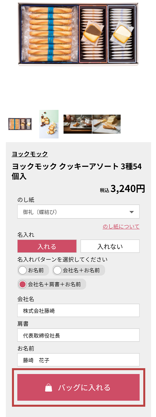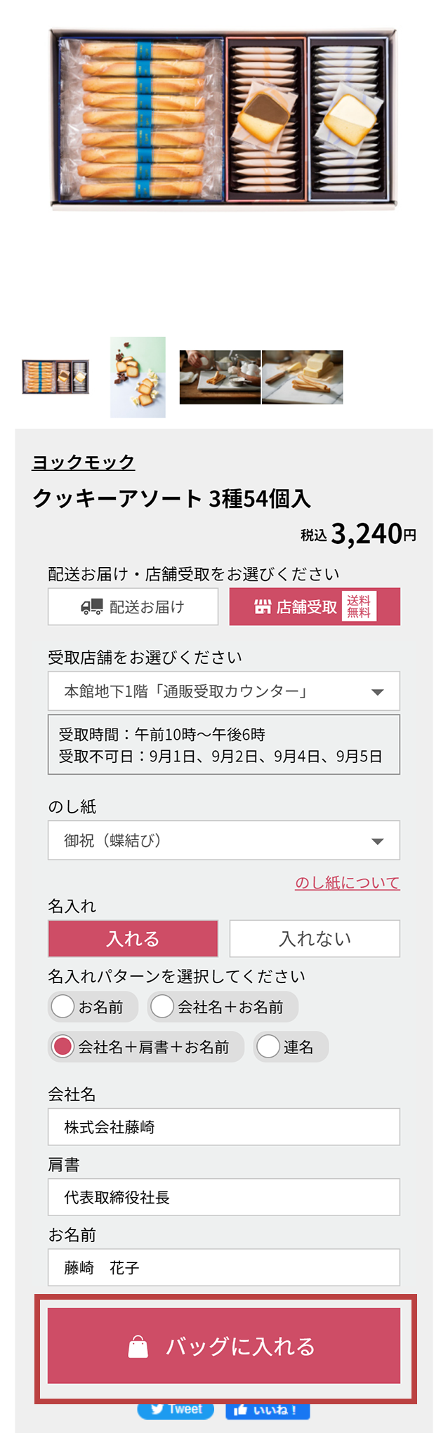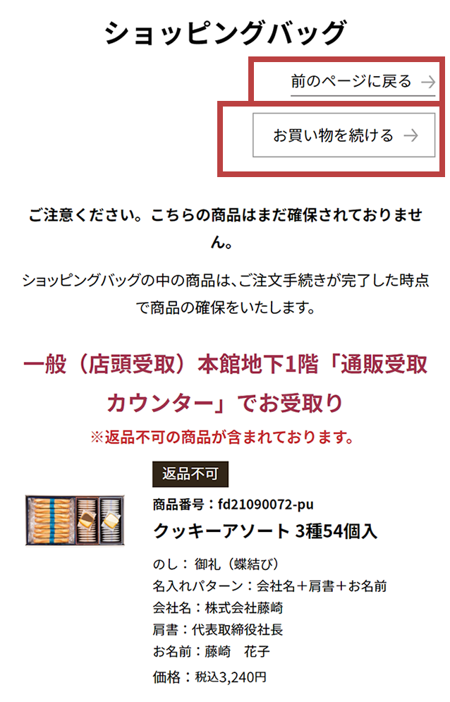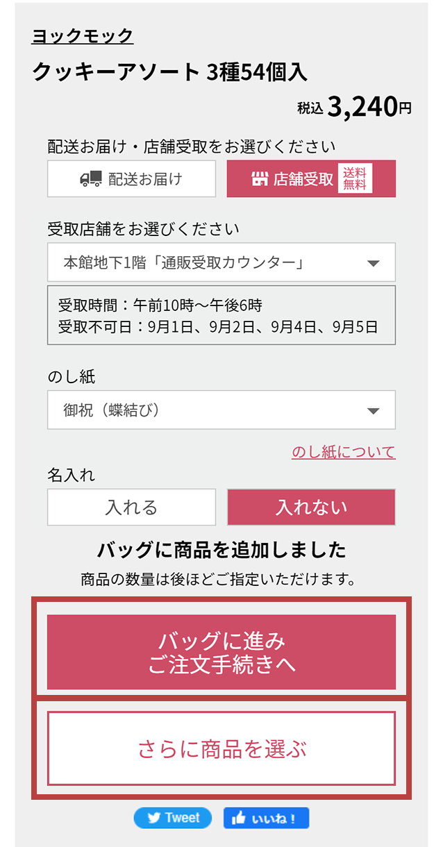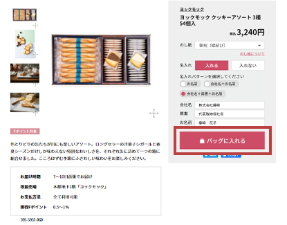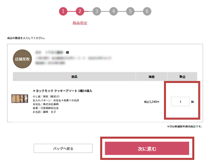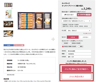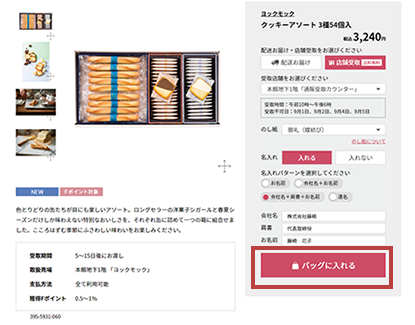 - STEP2. 店舗受取・のし紙・名入れを選び、ショッピングバッグに入れる
