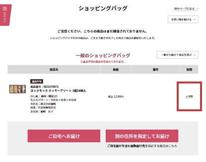 商品を削除する場合は、ショッピングバッグページで商品右側の「削除」を押してください。