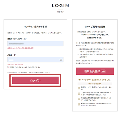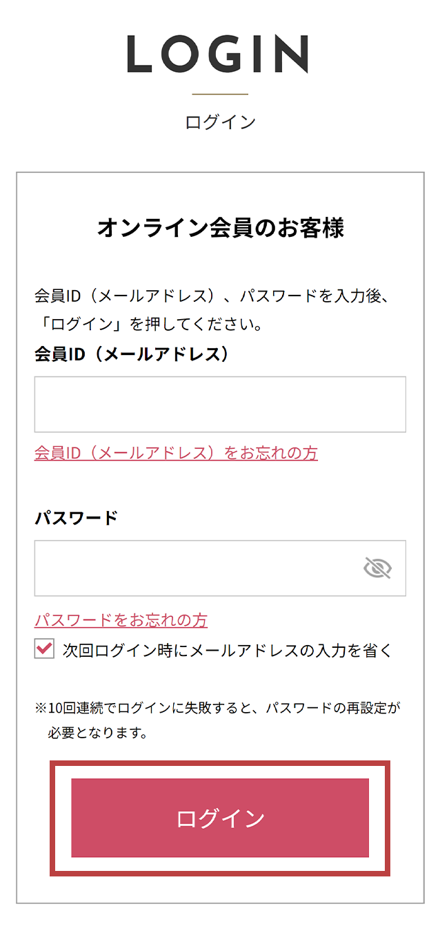 オンライン会員登録がお済みの方は、登録されているメールアドレス(会員ID)とパスワードを入力してログインしてください。