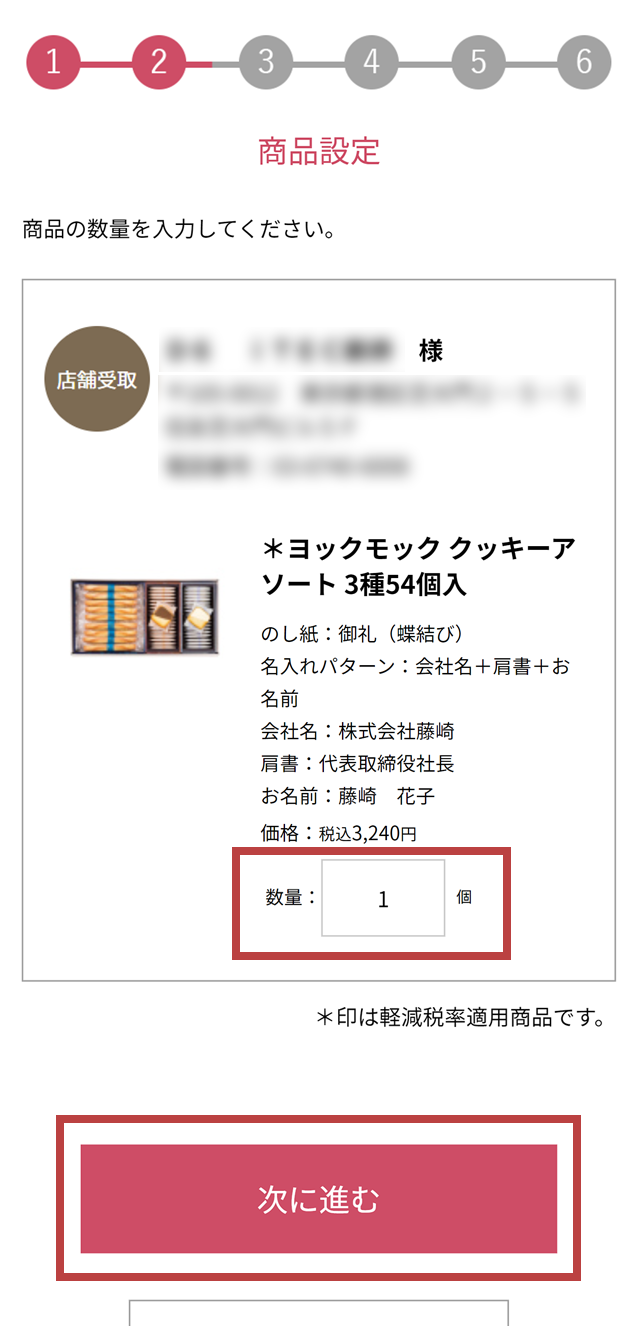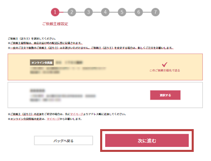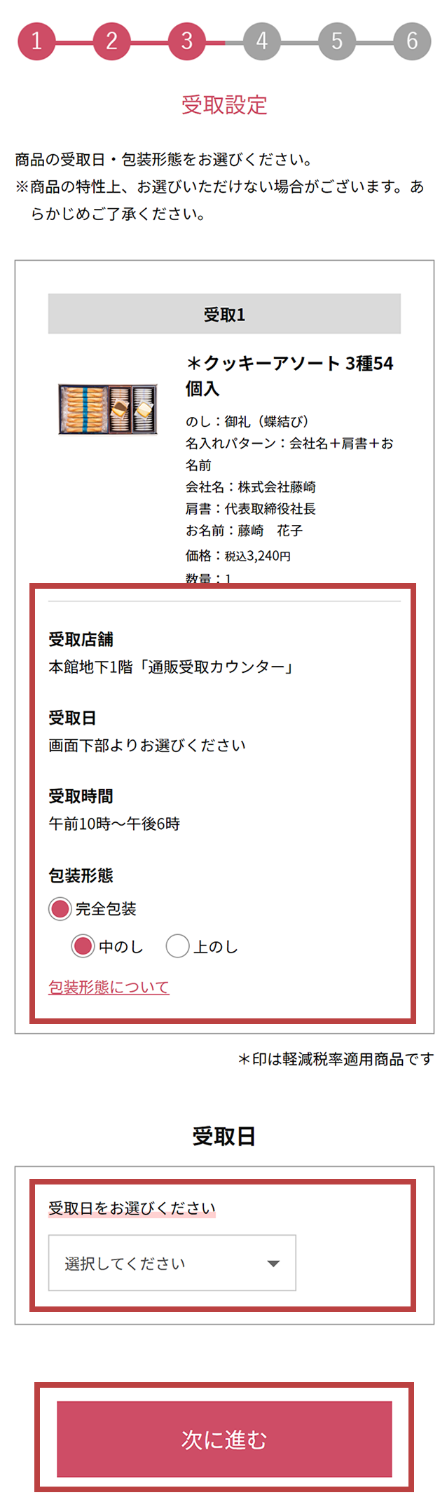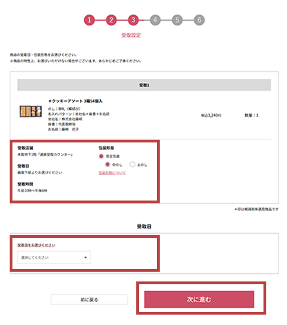 入力が完了しましたら、内容を確認後、「次に進む」を押してください。- 商品により、お受取日・包装形態をお選びいただけない場合がございます。