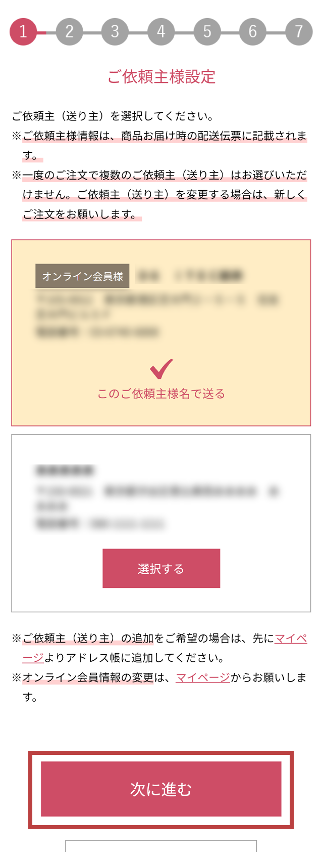 ご依頼主の追加をする場合は「マイページ」の「アドレス帳」に事前にご登録ください。- 一度のご注文で、複数のご依頼主名義では送れません。
