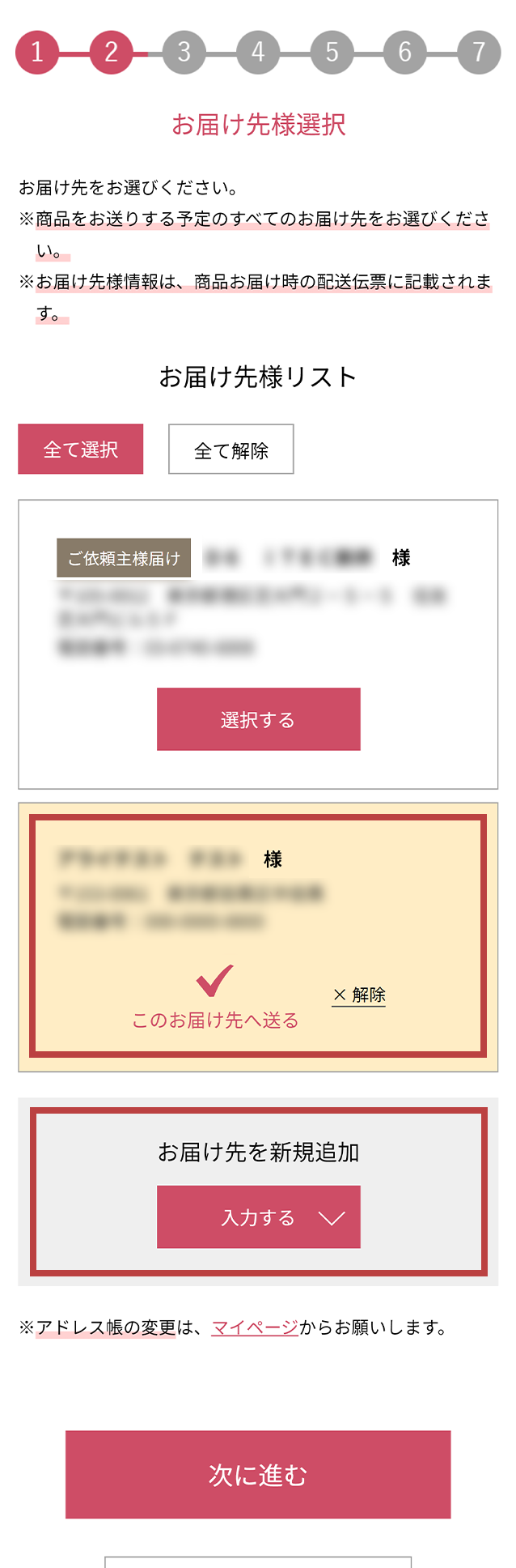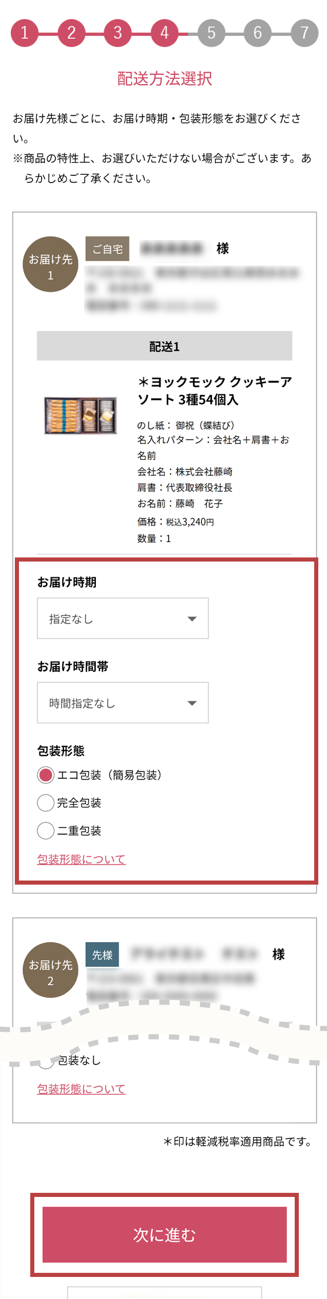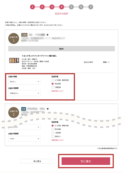 すべてのお届け先の配送設定が完了しましたら、内容を確認後、「次に進む」を押してください。- 商品によっては、お届け時期・包装形態をお選びいただけない場合がございます。