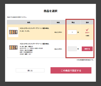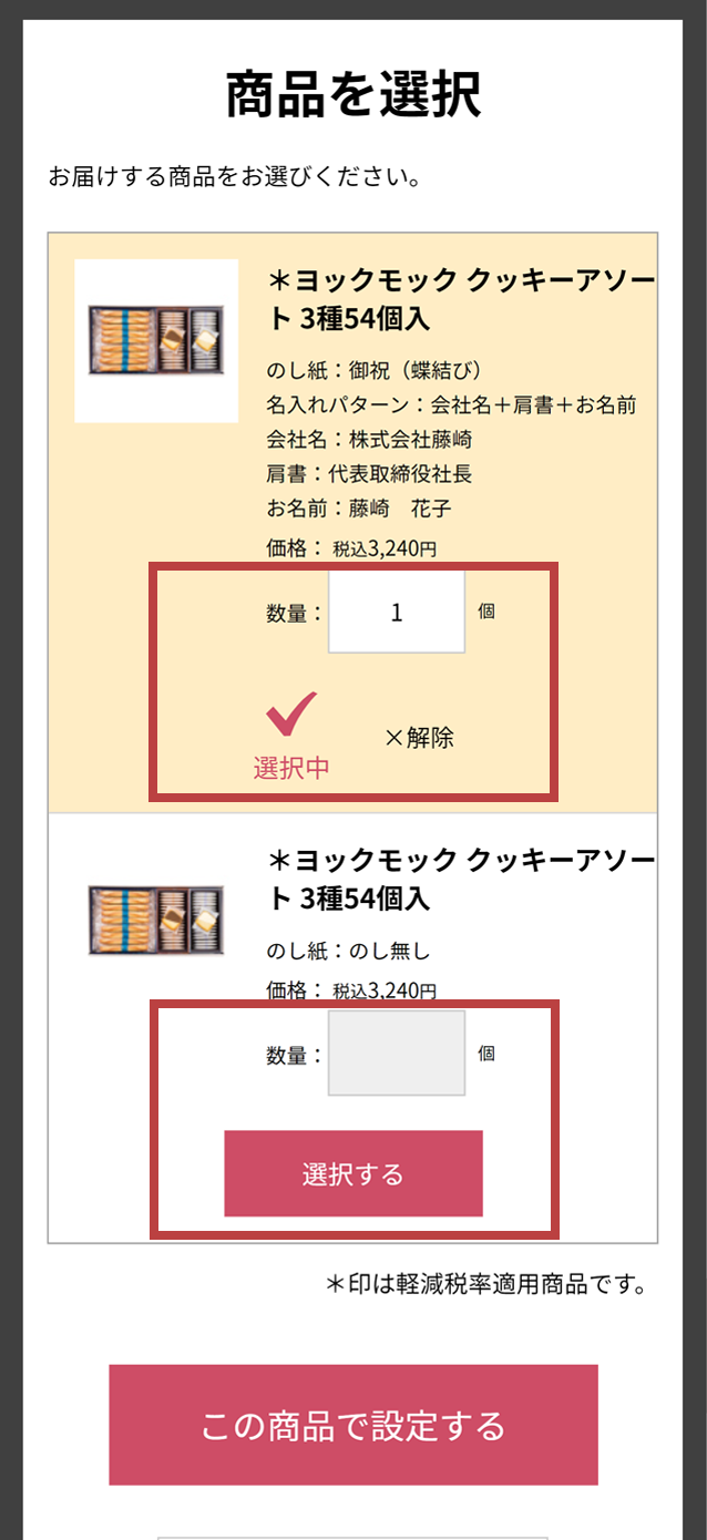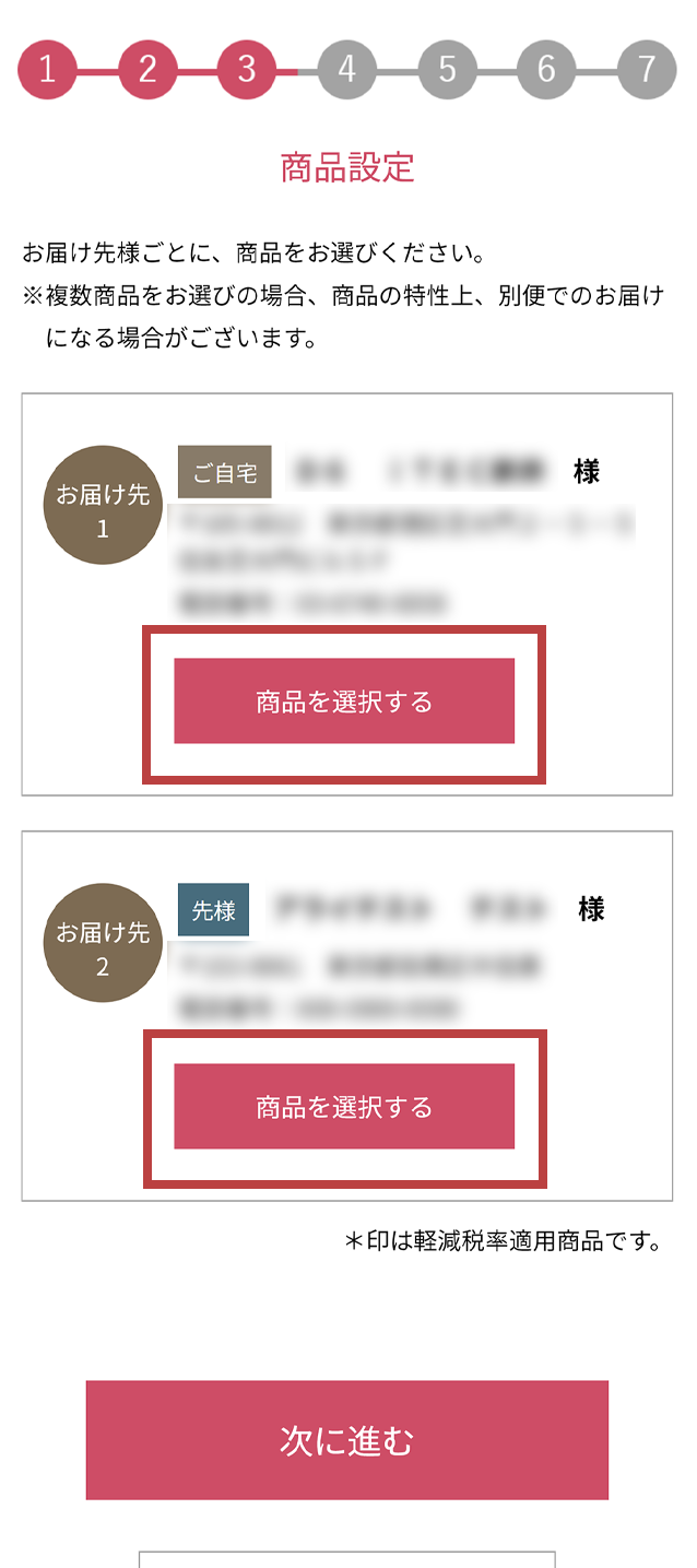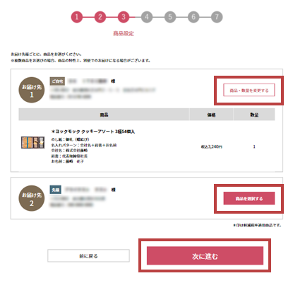 お届け先様ごとに、「商品を選択する」を押し、商品をお選びください。