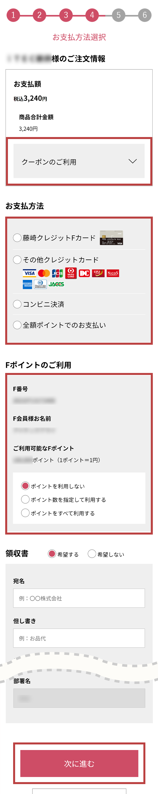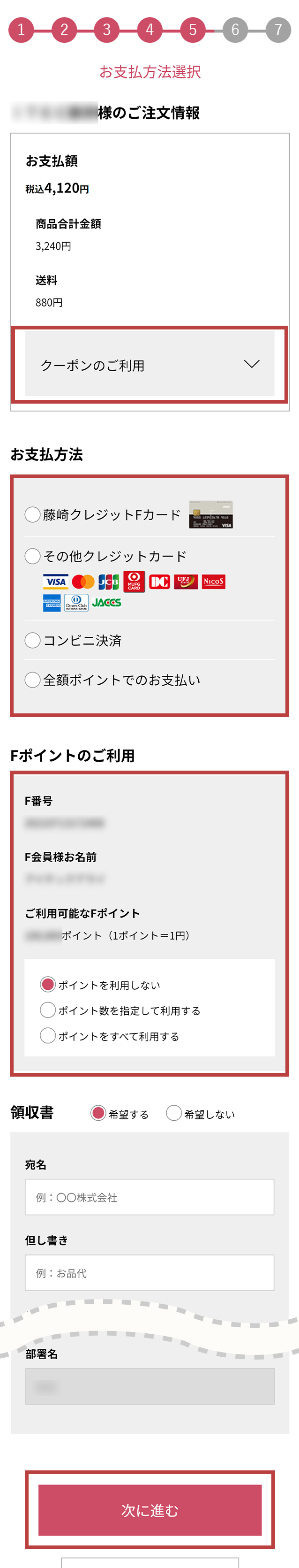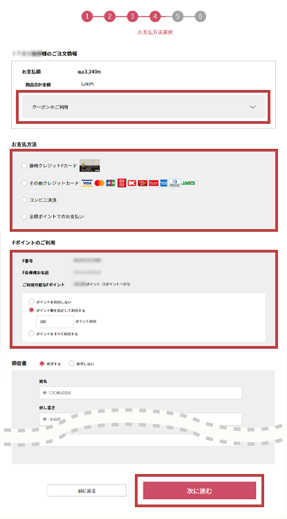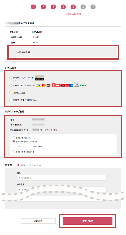 Fポイントをご利用の場合、ご利用Fポイント数を入力してください。- クーポン、Fポイント利用後の残りの金額は指定したお支払方法で決済されます。