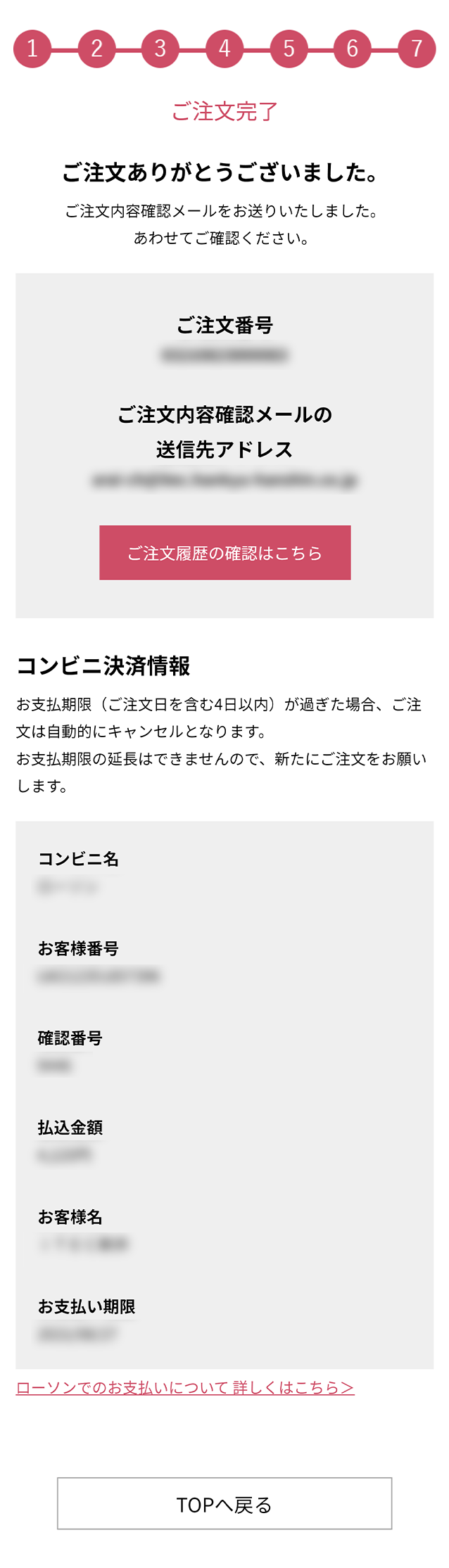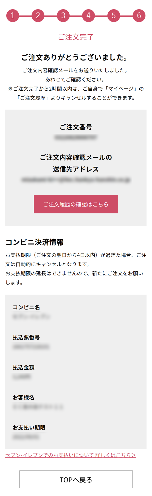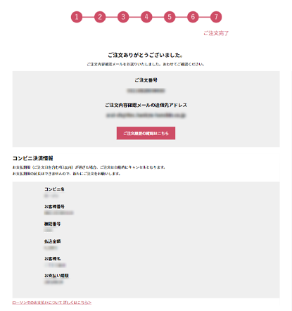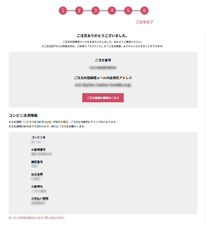- コンビニ決済をお選びいただいた場合、お客様番号などが表示されますので、スクリーンショットや印刷など保管をおすすめします。(自動送信されるご注文内容確認メールにも記載されます)