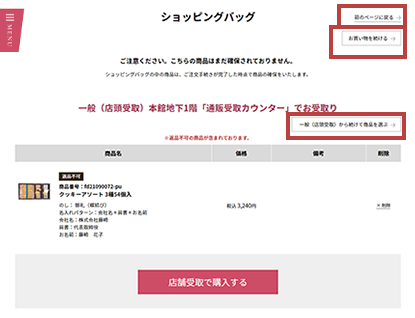 他の商品をさらに追加で注文する場合は、「前のページに戻る」か「お買い物を続ける」、または「店舗受取から続けて商品を選ぶ」を押し、STEP1から2までの操作でショッピングバッグに商品を追加してください。