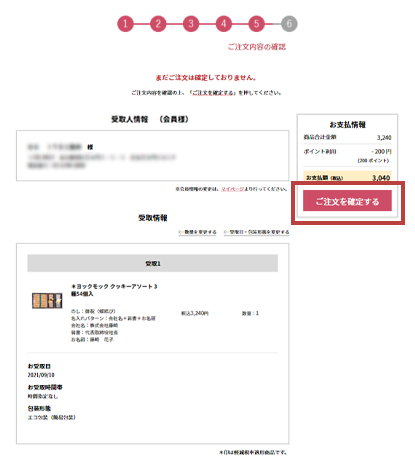 ご注文商品・受取情報・お支払いについて、内容をご確認ください。